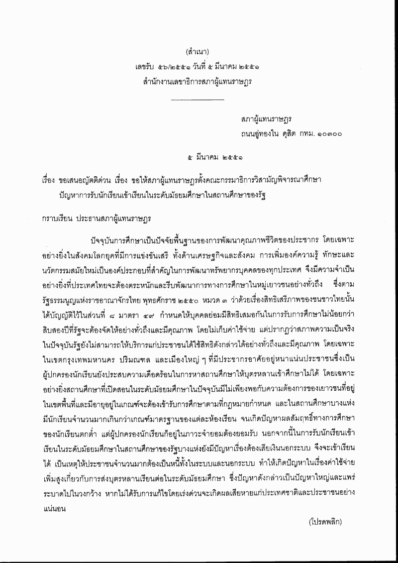 ชื่อเอกสาร :   ญัตติ เรื่อง ขอให้สภาผู้แทนราษฎรตั้งคณะกรรมาธิการวิสามัญพิจารณาศึกษาปัญหาการรับนักเรียนเข้าเรียนในระดับมัธยมศึกษาในสถานศึกษาของรัฐ (นายสมัย เจริญช่าง กับคณะ เป็นผู้เสนอ)