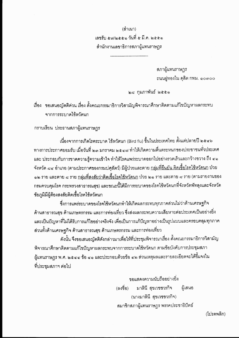 • ญัตติ เรื่อง ตั้งคณะกรรมาธิการวิสามัญพิจารณาศึกษาติดตามแก้ไขปัญหาผลกระทบจากการระบาดไข้หวัดนก (นางมาลินี สุขเวชชวรกิจ กับคณะ เป็นผู้เสนอ)