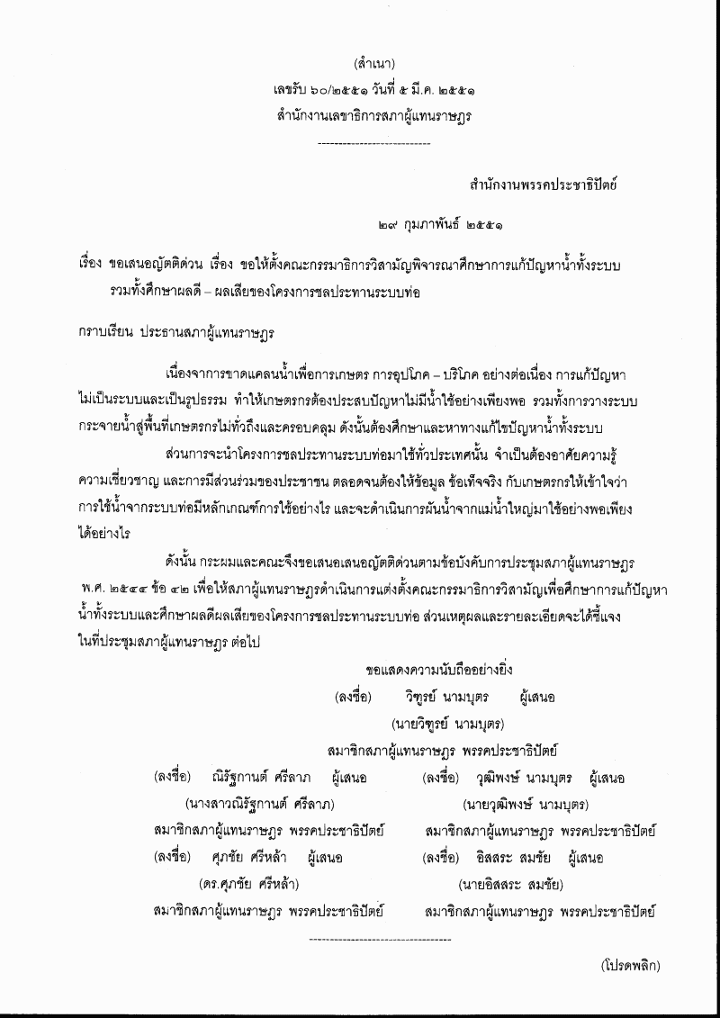 • ญัตติ เรื่อง ขอให้ตั้งคณะกรรมาธิการวิสามัญพิจารณาศึกษาการแก้ปัญหาน้ำทั้งระบบ รวมทั้งศึกษาผลดี - ผลเสียของโครงการชลประทานระบบท่อ (นายวิฑูรย์ นามบุตร กับคณะ เป็นผู้เสนอ)