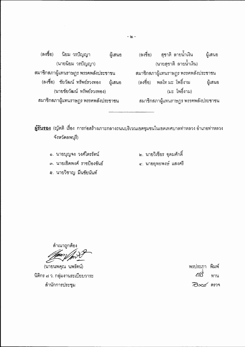 ญัตติ เรื่อง การก่อสร้างเกาะกลางถนนบริเวณเขตชุมชนในเขตเทศบาลท่าหลวง อำเภอท่าหลวง จังหวัดลพบุรี (นายอำนวย คลังผา กับคณะ เป็นผู้เสนอ) |