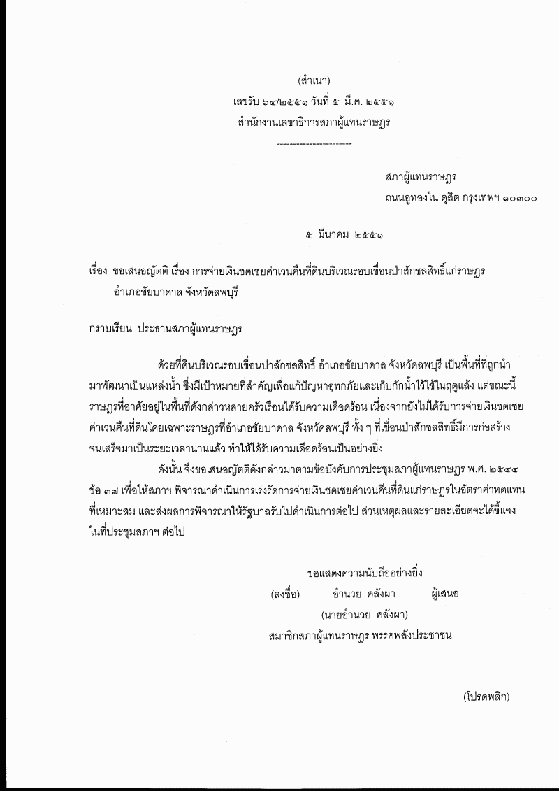 ญัตติ เรื่อง การจ่ายเงินชดเชยค่าเวนคืนที่ดินบริเวณรอบเขื่อนป่าสักชลสิทธิ์แก่ราษฎร อำเภอชัยบาดาล จังหวัดลพบุรี (นายอำนวย คลังผา กับคณะ เป็นผู้เสนอ) |