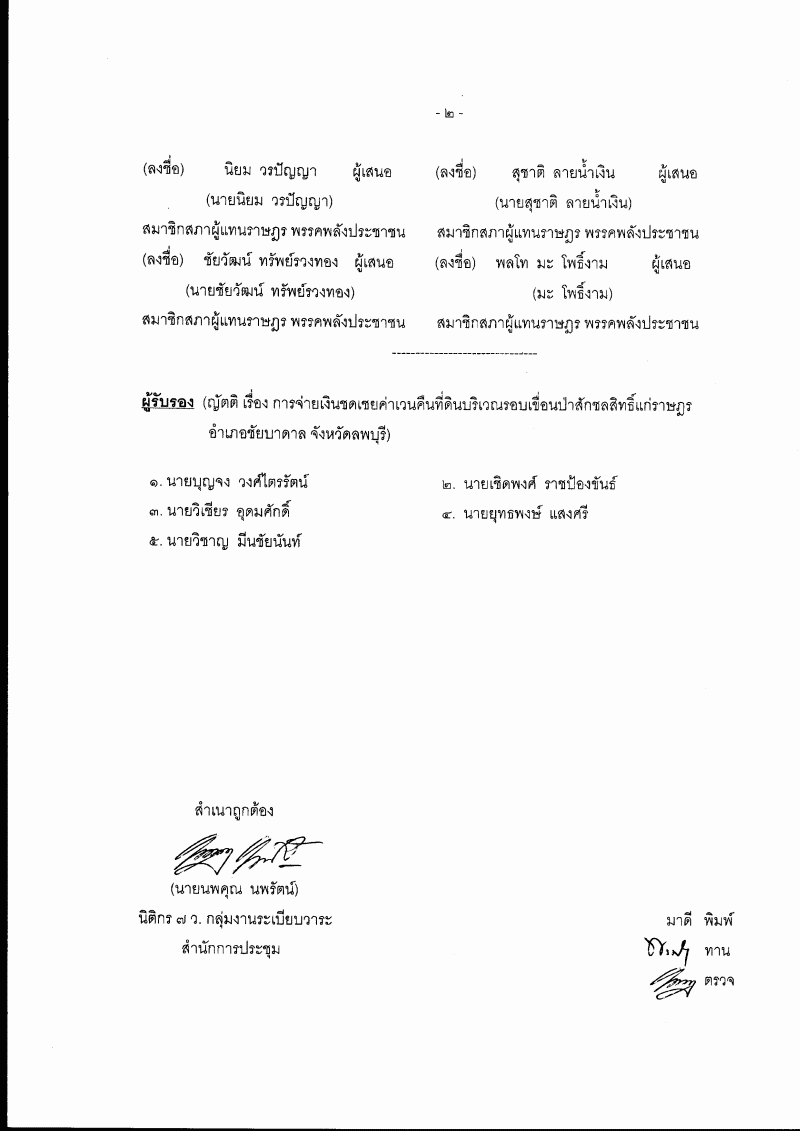 • ญัตติ เรื่อง การจ่ายเงินชดเชยค่าเวนคืนที่ดินบริเวณรอบเขื่อนป่าสักชลสิทธิ์แก่ราษฎร อำเภอชัยบาดาล จังหวัดลพบุรี (นายอำนวย คลังผา กับคณะ เป็นผู้เสนอ)