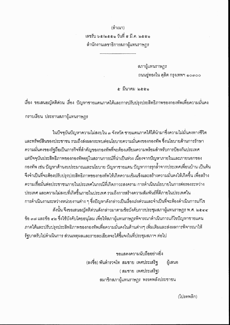 ญัตติ เรื่อง ปัญหาชายแดนภาคใต้และการปรับปรุงประสิทธิภาพของกองทัพเพื่อความมั่นคง (พันตำรวจโท สมชาย เพศประเสริฐ และนายบุญเลิศ ครุฑขุนทด เป็นผู้เสนอ) |