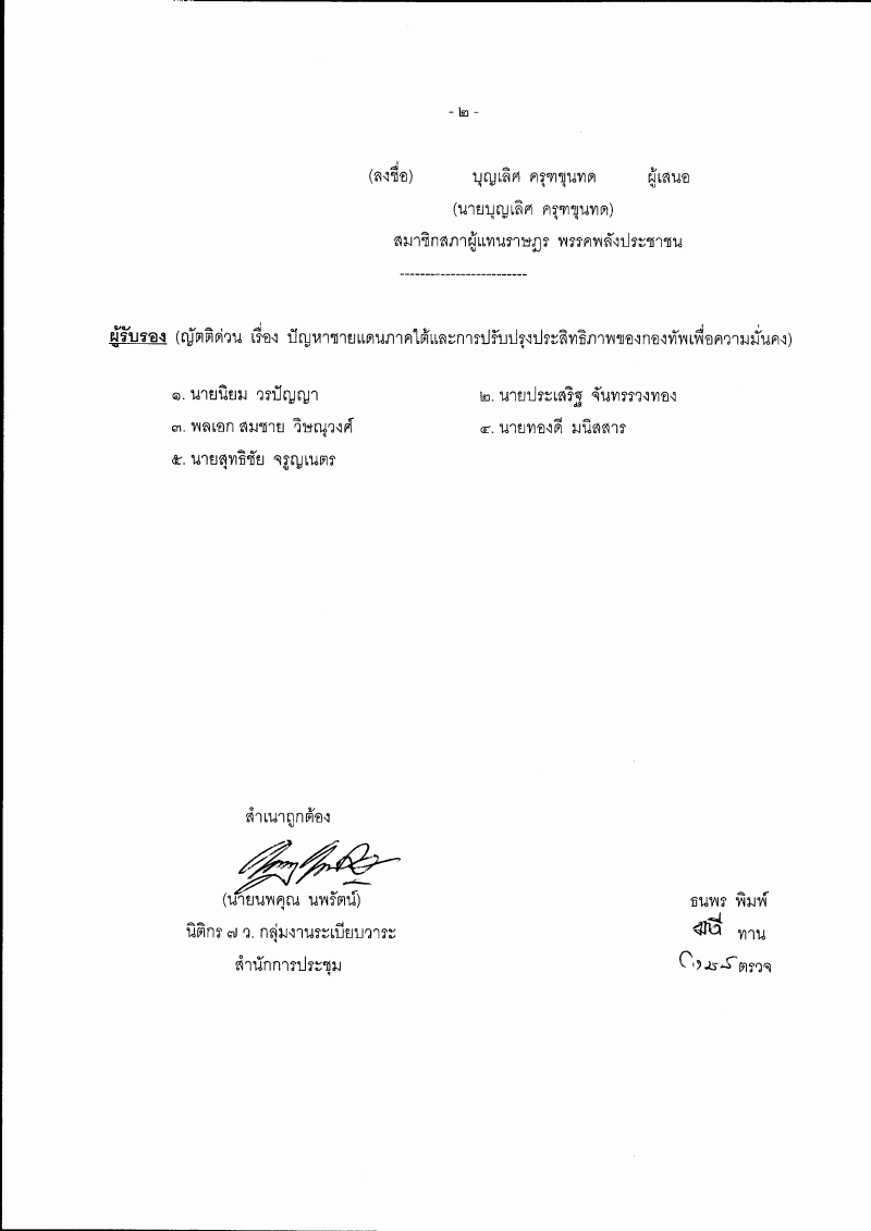 • ญัตติ เรื่อง ปัญหาชายแดนภาคใต้และการปรับปรุงประสิทธิภาพของกองทัพเพื่อความมั่นคง (พันตำรวจโท สมชาย เพศประเสริฐ และนายบุญเลิศ ครุฑขุนทด เป็นผู้เสนอ)