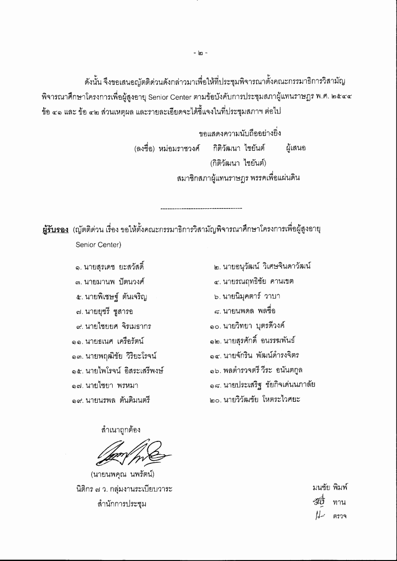 ญัตติ เรื่อง ขอให้ตั้งคณะกรรมาธิการวิสามัญพิจารณาศึกษาโครงการเพื่อผู้สูงอายุ Senior Center (หม่อมราชวงศ์กิติวัฒนา ไชยันต์ เป็นผู้เสนอ) |