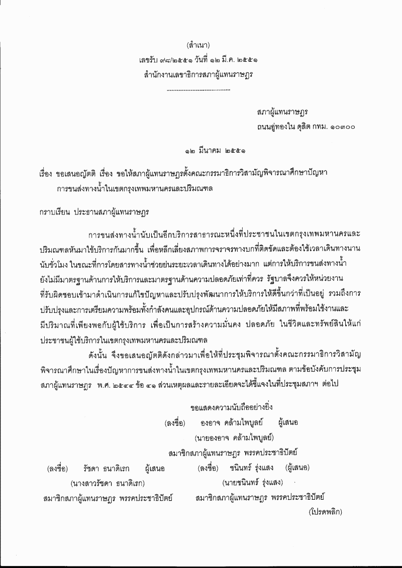 ญัตติ เรื่อง ขอให้สภาผู้แทนราษฎรตั้งคณะกรรมาธิการวิสามัญพิจารณาศึกษาปัญหาการขนส่งทางน้ำในเขตกรุงเทพมหานครและปริมณฑล (นายองอาจ คล้ามไพบูลย์ กับคณะ เป็นผู้เสนอ) |