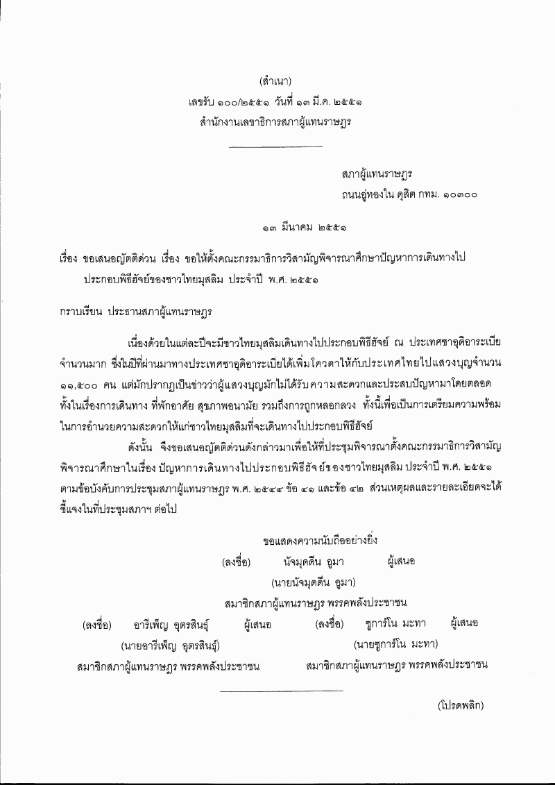ญัตติ เรื่อง ขอให้ตั้งคณะกรรมาธิการวิสามัญพิจารณาศึกษาปัญหาการเดินทางไปประกอบพิธีฮัจย์ของชาวไทยมุสลิม ประจำปี พ.ศ. ๒๕๕๑ (นายมัจมุดดีน อูมา กับคณะ เป็นผู้เสนอ) |