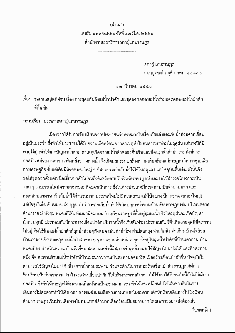 ญัตติ เรื่อง การขุดแก้มลิงแม่น้ำป่าสักและขุดลอกคลองแม่น้ำร่วมและคลองแม่น้ำป่าสักที่ตื้นเขิน (นายนิยม วรปัญญา และนายสุชาติ ลายน้ำเงิน เป็นผู้เสนอ) |