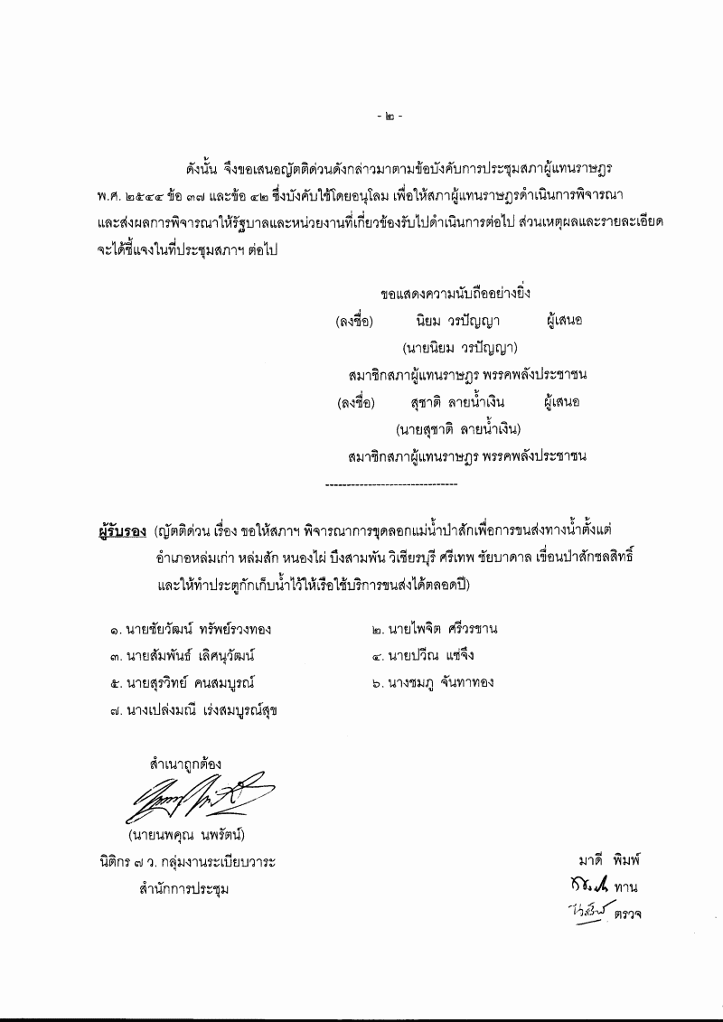 ญัตติ เรื่อง ขอให้สภาฯ พิจารณาการขุดลอกแม่น้ำป่าสักเพื่อการขนส่งทางน้ำตั้งแต่อำเภอหล่มเก่า หล่มสัก หนองไผ่ บึงสามพัน วิเชียรบุรี ศรีเทพ ชัยบาดาล เขื่อนป่าสักชลสิทธิ์ และให้ทำประตูกักเก็บน้ำไว้ให้เรือใช้บริการขนส่งได้ตลอดปี (นายนิยม วรปัญญา และนายสุชาติ ลายน้ำเงิน เป็นผู้เสนอ) |