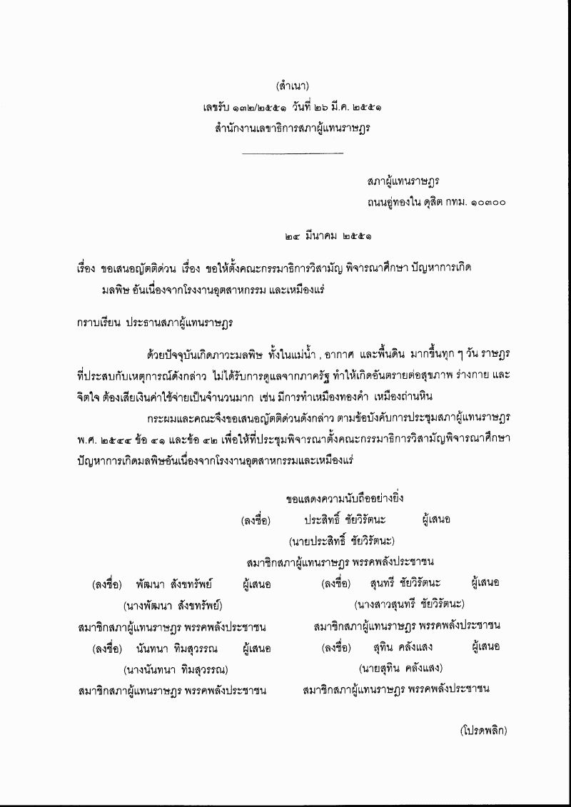 • (๒) ญัตติ เรื่อง ขอให้ตั้งคณะกรรมาธิการวิสามัญ พิจารณาศึกษา ปัญหาการเกิดมลพิษอันเนื่องจากโรงงานอุตสาหกรรม และ เหมืองแร่ (นายประสิทธิ์ ชัยวิรัตนะ กับคณะ เป็นผู้เสนอ)