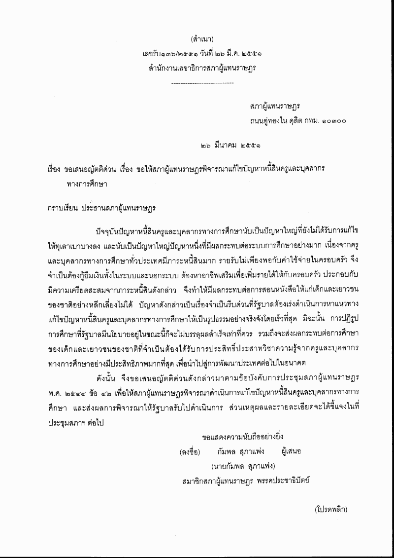 (๕) ญัตติ เรื่อง ขอให้สภาผู้แทนราษฎรพิจารณาแก้ไขปัญหาหนี้สินครูและบุคลากรทางการศึกษา (นายกัมพล สุภาแพ่ง กับคณะ เป็นผู้เสนอ) |