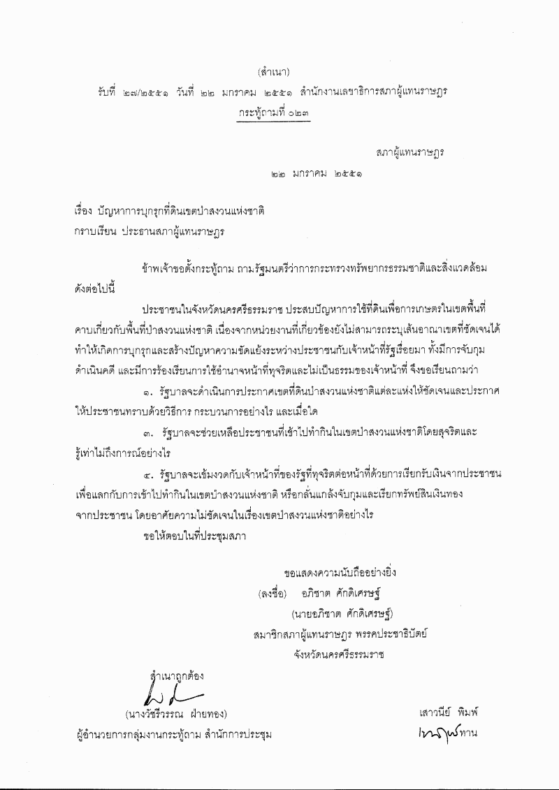 กระทู้ถาม ที่ ๐๒๓ เรื่อง ปัญหาการบุกรุกที่ดินเขตป่าสงวนแห่งชาติ นายอภิชาต ศักดิเศรษฐ์ เป็นผู้ตั้งกระทู้ถาม ถาม รัฐมนตรีว่าการกระทรวงทรัพยากรธรรมชาติและสิ่งแวดล้อม |