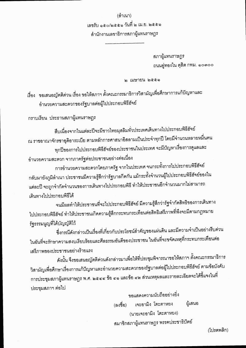 • (2) ญัตติ เรื่อง ขอให้สภาฯ ตั้งคณะกรรมาธิการวิสามัญเพื่อศึกษาการแก้ปัญหาและอำนวยความสะดวกของรัฐบาลต่อผู้ไปประกอบพิธีฮัจย์ (นายเจะอามิง โตะตาหยง กับคณะ เป็นผู้เสนอ)