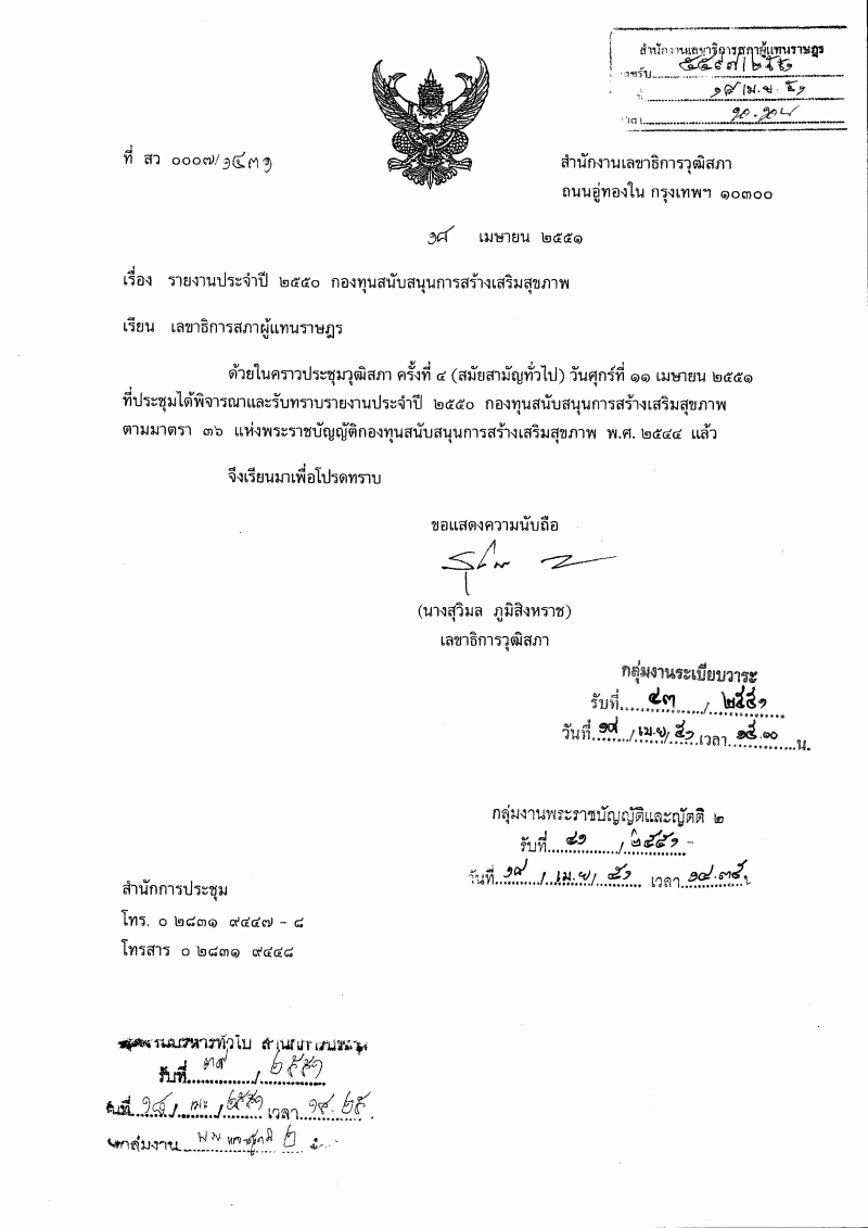 รับทราบเรื่องวุฒิสภาได้พิจารณาและรับทราบรายงานประจำปี ๒๕๕๐ กองทุนสนับสนุนการสร้างเสริมสุขภาพ |
