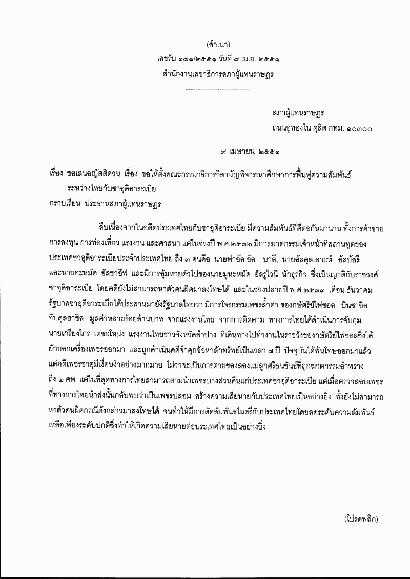 ชื่อเอกสาร :   ญัตติด่วน เรื่อง ขอให้ตั้งคณะกรรมาธิการวิสามัญพิจารณาศึกษาการฟื้นฟูความสัมพันธ์ระหว่างไทยกับซาอุดิอาระเบีย (นางฟาริดา สุไลมาน กับคณะ เป็นผู้เสนอ)