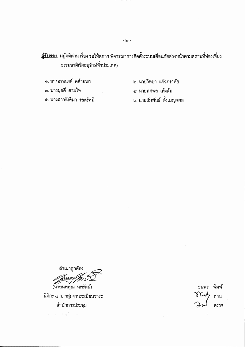 ญัตติ เรื่อง ขอให้สภาฯ พิจารณาการติดตั้งระบบเตือนภัยล่วงหน้าตามสถานที่ท่องเที่ยวธรรมชาติเชิงอนุรักษ์ทั่วประเทศ (นายนริศ ขำนุรักษ์ กับคณะ เป็นผู้เสนอ) |
