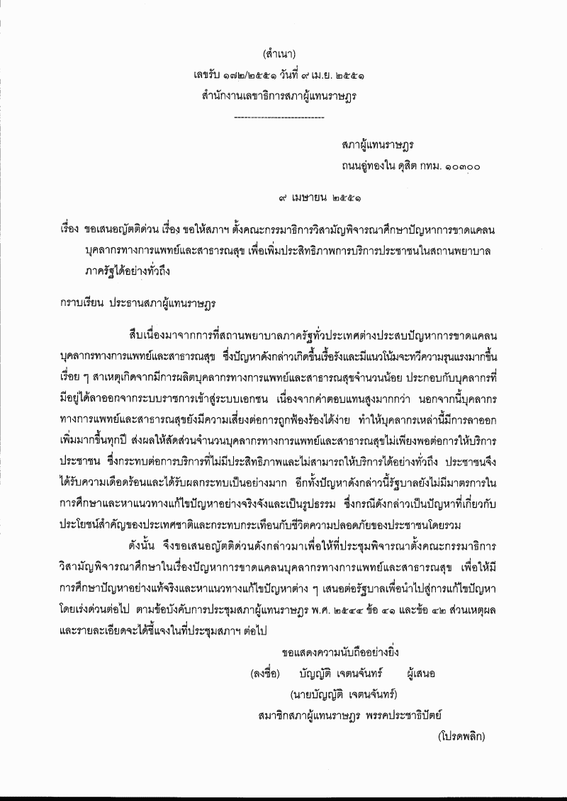 • (6) ญัตติ เรื่อง ขอให้สภาฯ ตั้งคณะกรรมาธิการวิสามัญพิจารณาศึกษาปัญหาการขาดแคลนบุคลากรทางการแพทย์และสาธารณสุข เพื่อเพิ่มประสิทธิภาพการบริการประชาชนในสถานพยาบาลภาครัฐได้อย่างทั่วถึง (นายบัญญัติ เจตนจันทร์ กับคณะ เป็นผู้เสนอ)