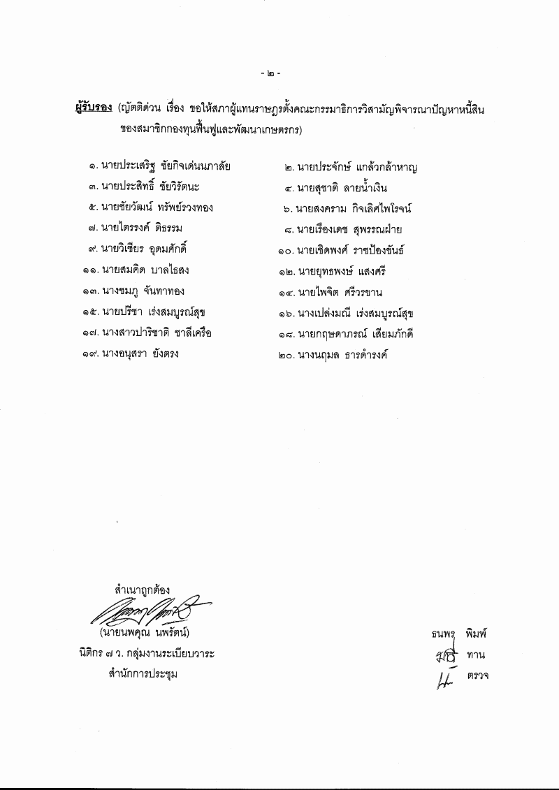 • (8) ญัตติ เรื่อง ขอให้สภาผู้แทนราษฎรตั้งคณะกรรมาธิการวิสามัญพิจารณาปัญหาหนี้สินของสมาชิกกองทุนฟื้นฟูและพัฒนาเกษตรกร (นายอำนวย คลังผา เป็นผู้เสนอ)