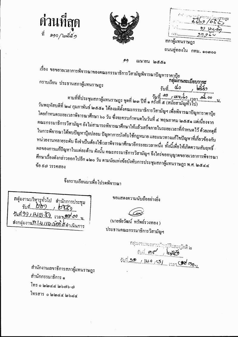 คณะกรรมาธิการวิสามัญพิจารณาปัญหาราคาปุ๋ย ขอขยายเวลาพิจารณาศึกษาเรื่องดังกล่าวออกไปอีก ๑๒๐ วัน นับแต่วันที่ ๕ พฤษภาคม ๒๕๕๑ |