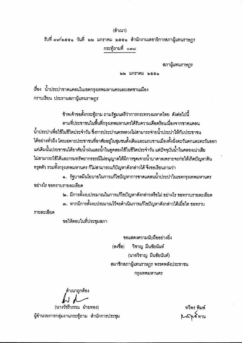 กระทู้ถาม ที่ ๐๓๘ เรื่อง น้ำประปาขาดแคลนในเขตกรุงเทพมหานครและเขตชานเมือง นายวิชาญ มีนชัยนันท์ เป็นผู้ตั้งกระทู้ถาม ถาม รัฐมนตรีว่าการกระทรวงมหาดไทย |