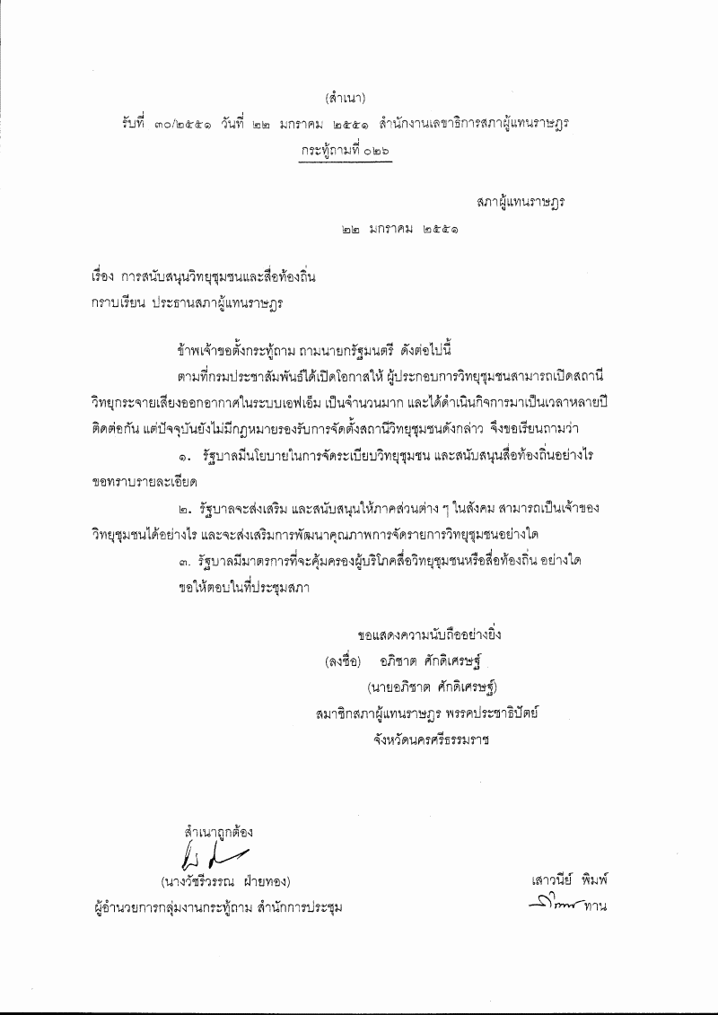 กระทู้ถาม ที่ ๐๒๖ เรื่อง การสนับสนุนวิทยุชุมชนและสื่อท้องถิ่น นายอภิชาต ศักดิเศรษฐ์ เป็นผู้ตั้งกระทู้ถาม ถาม นายกรัฐมนตรี |