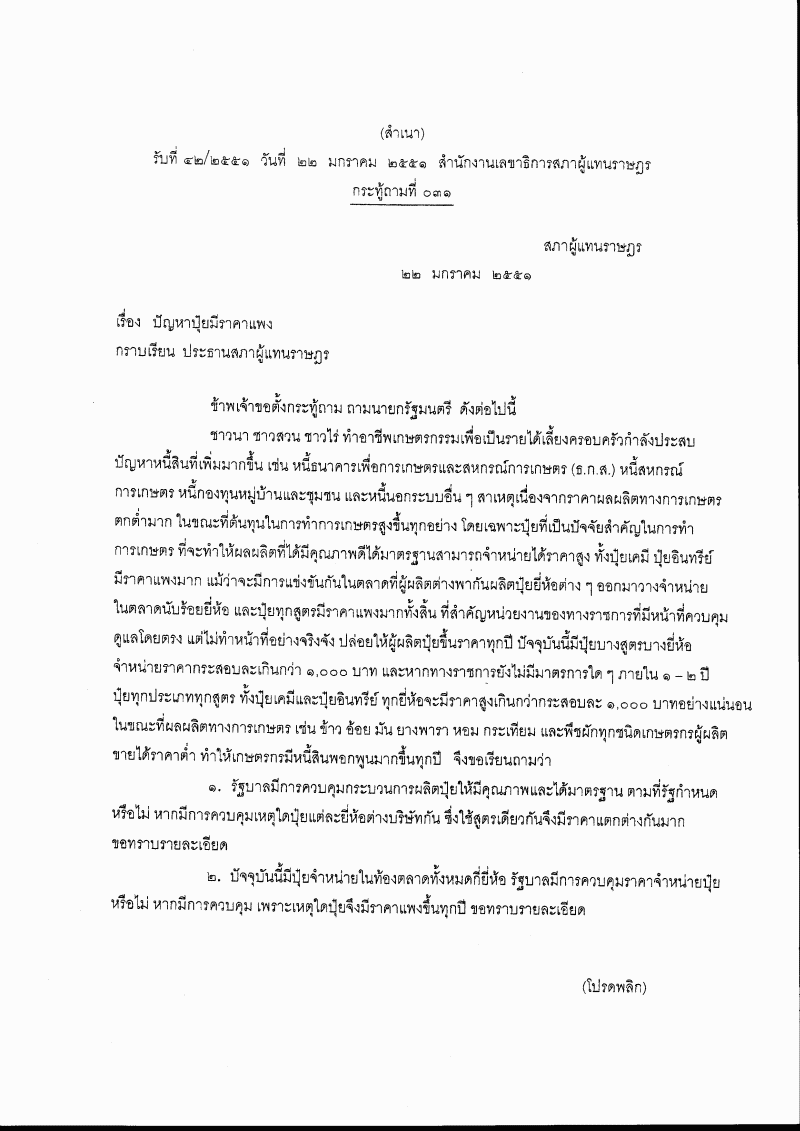 กระทู้ถาม ที่ ๐๓๑ เรื่อง ปัญหาปุ๋ยมีราคาแพง นายอิสสระ สมชัย เป็นผู้ตั้งกระทู้ถาม ถาม นายกรัฐมนตรี |