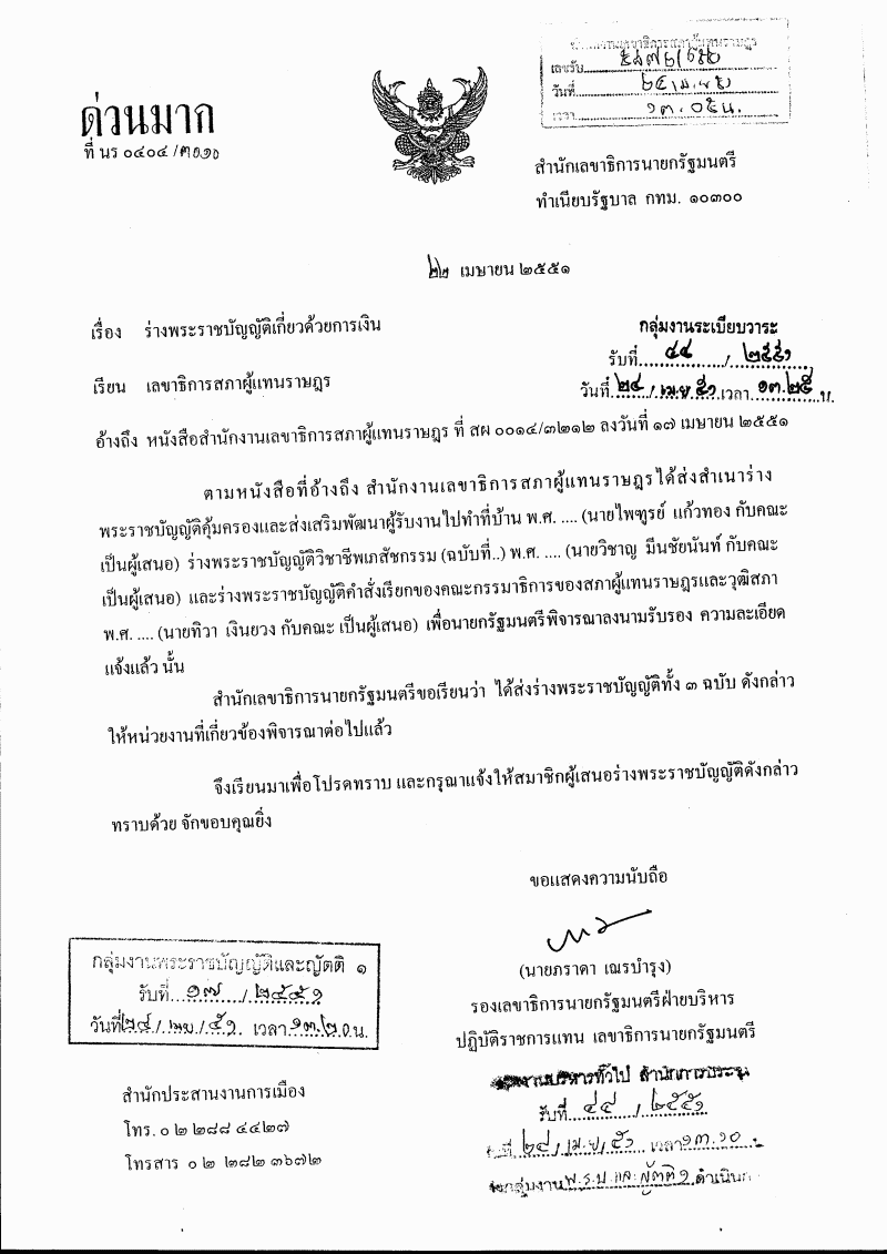 รับทราบเรื่องสำนักเลขาธิการนายกรัฐมนตรีได้ส่งร่างพระราชบัญญัติเกี่ยวด้วยการเงินให้หน่วยงานที่เกี่ยวข้องพิจารณา |