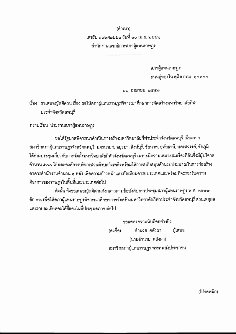 • (1) ญัตติ เรื่อง ขอให้สภาผู้แทนราษฎรพิจารณาศึกษาการจัดสร้างมหาวิทยาลัยกีฬาประจำจังหวัดลพบุรี (นายอำนวย คลังผา เป็นผู้เสนอ)