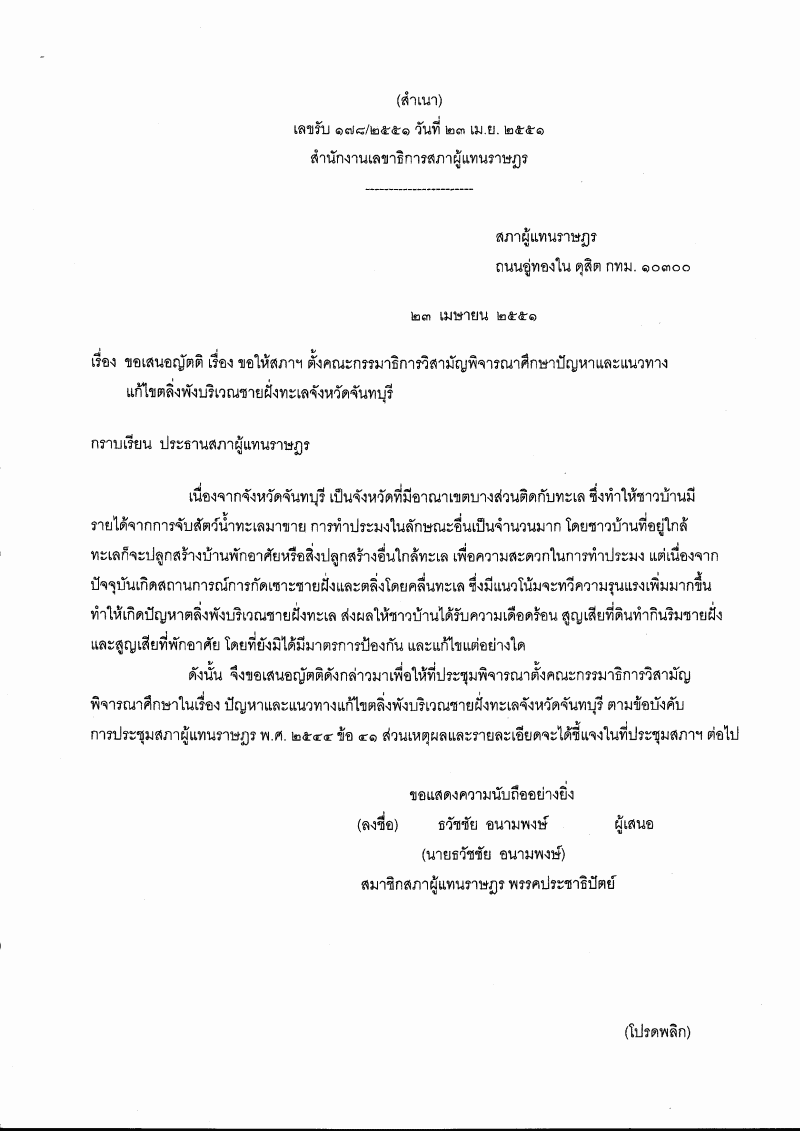 ชื่อเอกสาร :   (4) ญัตติ เรื่อง ขอให้สภาฯ ตั้งคณะกรรมาธิการวิสามัญพิจารณาศึกษาปัญหาและแนวทางแก้ไขตลิ่งพังบริเวณชายฝั่งทะเลจังหวัดจันทบุรี (นายธวัชชัย อนามพงษ์ เป็นผู้เสนอ)