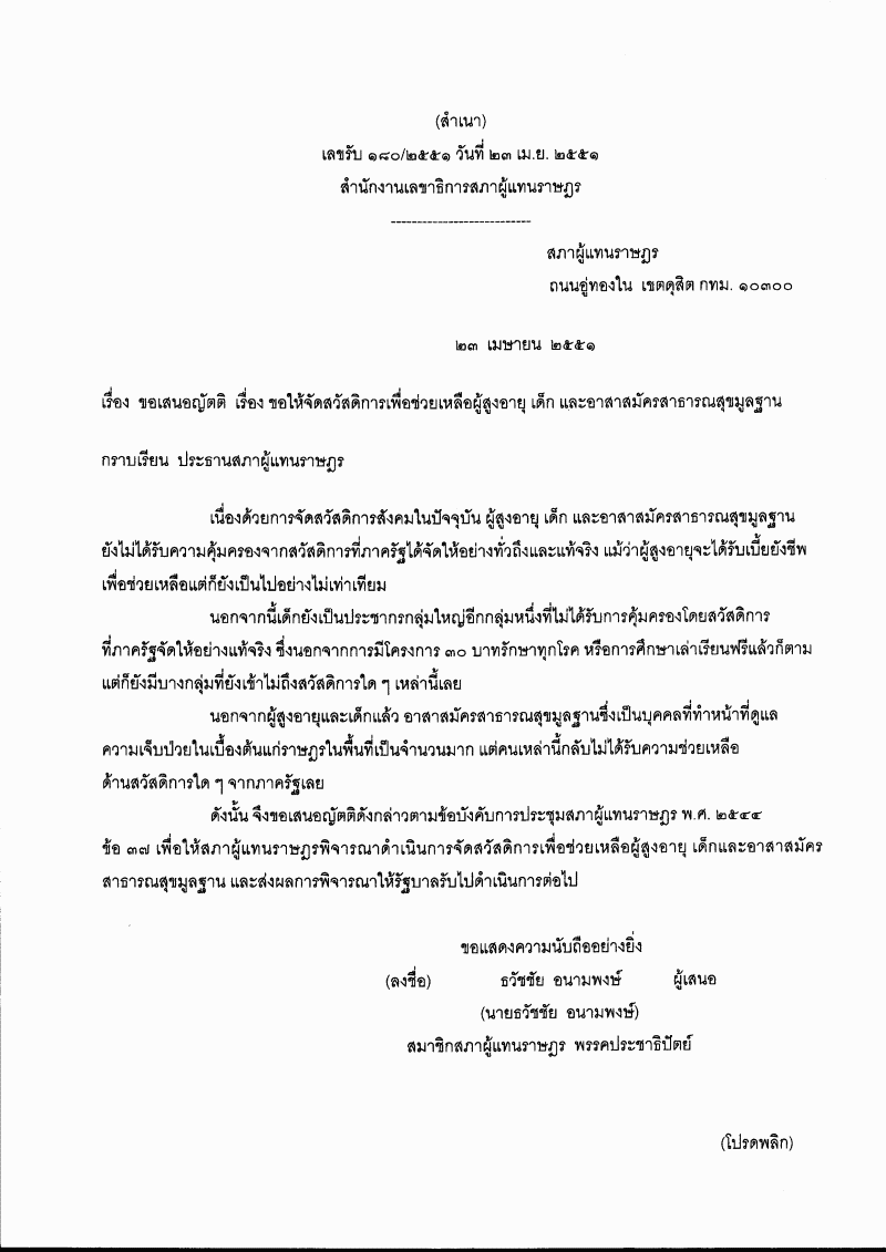 • (5) ญัตติ เรื่อง ขอให้จัดสวัสดิการเพื่อช่วยเหลือผู้สูงอายุ เด็ก และอาสาสมัครสาธารณสุขมูลฐาน (นายธวัชัย อนามพงษ์ เป็นผู้เสนอ)