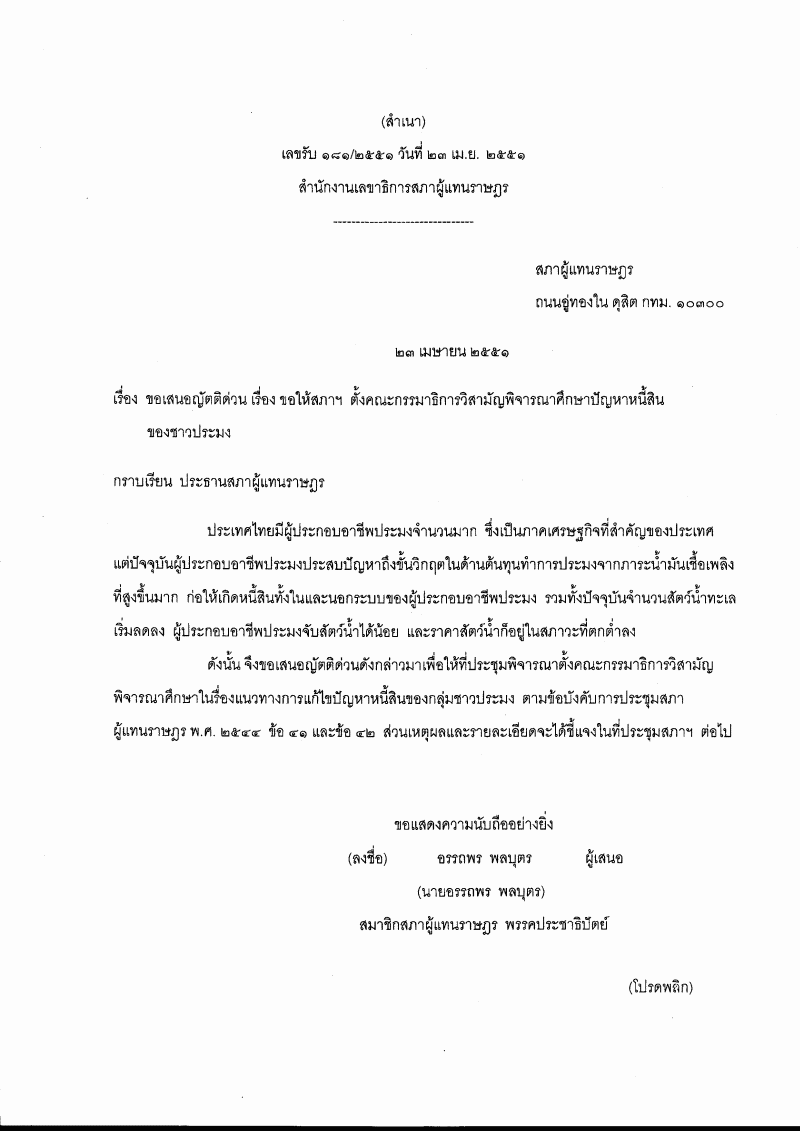 (6) ญัตติ เรื่อง ขอให้สภาฯ ตั้งคณะกรรมาธิการวิสามัญพิจารณาศึกษาปัญหาหนี้สินของชาวประมง (นายอรรถพร พลบุตร กับคณะ เป็นผู้เสนอ) |