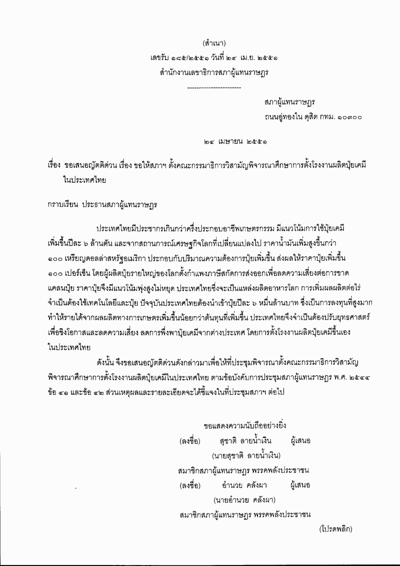 (10) ญัตติ เรื่อง ขอให้สภาฯ ตั้งคณะกรรมาธิการวิสามัญพิจารณาศึกษาการตั้งโรงงานผลิตปุ๋ยเคมีในประเทศไทย (นาสุชาติ ลายน้ำเงิน และนายอำนวย คลังผา เป็นผู้เสนอ) |