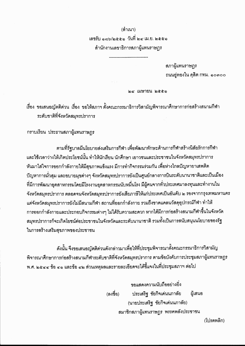 • (11) ญัตติ เรื่อง ขอให้สภาฯ ตั้งคณะกรรมาธิการวิสามัญพิจารณาศึกษาการก่อสร้างสนามกีฬาระดับชาติที่จังหวัดสมุทรปราการ (นายประเสริฐ ชัยกิจเด่นนภาลัย เป็นผู้เสนอ)