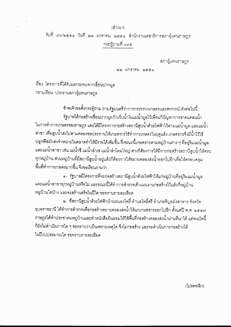 กระทู้ถามที่ ๐๓๕ เรื่อง โครงการที่ได้รับผลกระทบจากเขื่อนปากมูล นายอิสสระ สมชัย เป็นผู้ตั้งกระทู้ถาม ถามรัฐมนตรีว่าการกระทรวงเกษตรและสหกรณ์ |