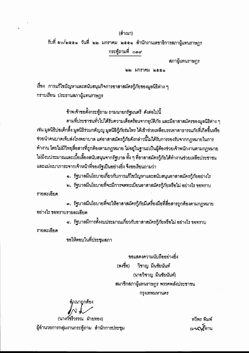 กระทู้ถามที่ ๐๓๙ เรื่อง การแก้ไขปัญหาและสนับสนุนกิจการอาสาสมัครกู้ภัยของมูลนิธิต่าง ๆ นายวิชาญ มีนชัยนันท์ เป็นผู้ตั้งกระทู้ถาม ถาม นายกรัฐมนตรี |