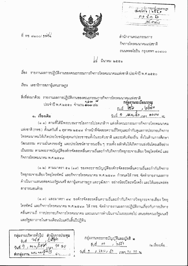 • รับทราบรายงานผลการปฏิบัติงานของคณะกรรมการกิจการโทรคมนาคมแห่งชาติประจำปี พ.ศ. ๒๕๕๐