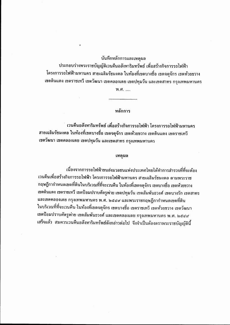 ชื่อเอกสาร :   (26) ร่างพระราชบัญญัติเวนคืนอสังหาริมทรัพย์เพื่อสร้างกิจการรถไฟฟ้า โครงการรถไฟฟ้ามหานคร สายเฉลิมรัชมงคล ในท้องที่เขตบางซื่อ เขตจตุจักร เขตห้วยขวาง เขตดินแดง เขตราชเทวี เขตวัฒนา เขตคลองเตย เขตปทุมวัน และเขตสาทร กรุงเทพมหานคร พ.ศ. .... (คณะรัฐมนตรี เป็นผู้เสนอ)