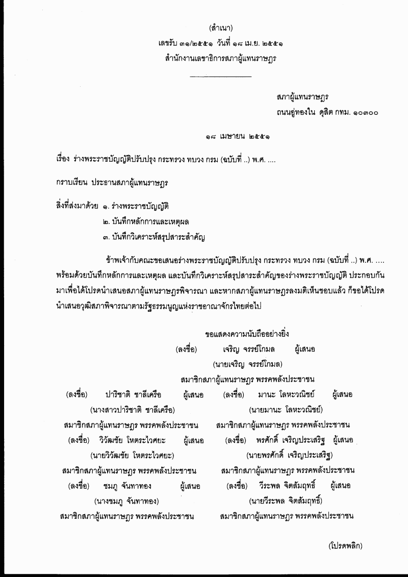 ชื่อเอกสาร :   (1) ร่างพระราชบัญญัติปรับปรุง กระทรวง ทบวง กรม (ฉบับที่ ..) พ.ศ. .... (นายเจริญ จรรย์โกมล กับคณะ เป็นผู้เสนอ)