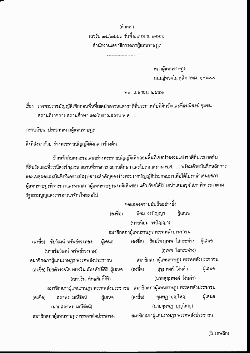 • (2) ร่างพระราชบัญญัติเพิกถอนพื้นที่เขตป่าสงวนแห่งชาติที่ประกาศทับที่ดินวัดและที่ธรณีสงฆ์ ชุมชน สถานที่ราชการ สถานศึกษา และโบราณสถาน พ.ศ. .... (นายนิยม วรปัญญา กับคณะ เป็นผู้เสนอ)