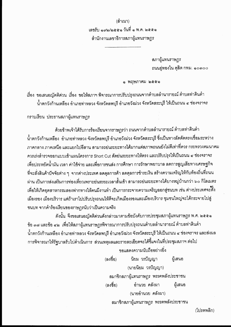 ชื่อเอกสาร :   (7) ญัตติ เรื่อง ขอให้สภาฯ พิจารณาการปรับปรุงถนนจากตำบลลำนารายณ์ ตำบลท่าดินดำ น้ำตกวังก้านเหลือง อำเภอท่าหลวง จังหวัดลพบุรี อำเภอวังม่วง จังหวัดสระบุรี ให้เป็นถนน ๔ ช่องจราจร (นายนิยม วรปัญญา และนายอำนวย คลังผา เป็นผู้เสนอ)