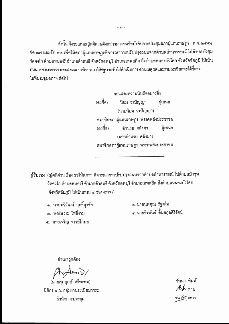 (8) ญัตติ เรื่อง ขอให้สภาฯ พิจารณาการปรับปรุงถนนจากตำบลลำนารายณ์ไปตำบลบัวชุม วัดจงโก ตำบลหนองรี อำเภอลำสนธิ จังหวัดลพบุรี อำเภอเทพสถิต ถึงตำบลหนองบัวโคก จังหวัดชัยภูมิ ให้เป็นถนน ๔ ช่องจราจร (นายนิยม วรปัญญา และนายอำนวย คลังผา เป็นผู้เสนอ) |