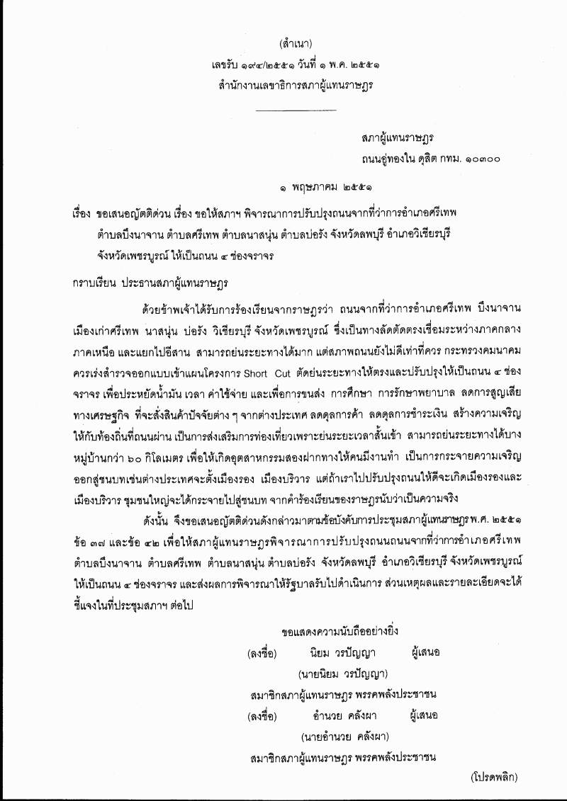 • (9) ญัตติ เรื่อง ขอให้สภาฯ พิจารณาการปรับปรุงถนนจากที่ว่าการอำเภอศรีเทพ ตำบลบึงนาจาน ตำบลศรีเทพ ตำบลนาสนุ่น ตำบลบ่อรัง จังหวัดลพบุรี อำเภอวิเชียรบุรี จังหวัดเพชรบูรณ์ ให้เป็นถนน ๔ ช่องจราจร (นายนิยม วรปัญญา และนายอำนวย คลังผา เป็นผู้เสนอ)