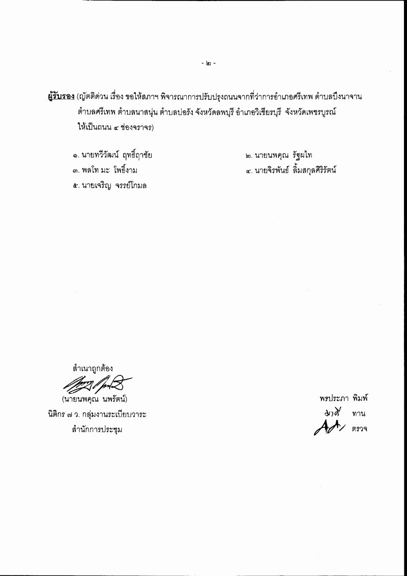 (9) ญัตติ เรื่อง ขอให้สภาฯ พิจารณาการปรับปรุงถนนจากที่ว่าการอำเภอศรีเทพ ตำบลบึงนาจาน ตำบลศรีเทพ ตำบลนาสนุ่น ตำบลบ่อรัง จังหวัดลพบุรี อำเภอวิเชียรบุรี จังหวัดเพชรบูรณ์ ให้เป็นถนน ๔ ช่องจราจร (นายนิยม วรปัญญา และนายอำนวย คลังผา เป็นผู้เสนอ) |