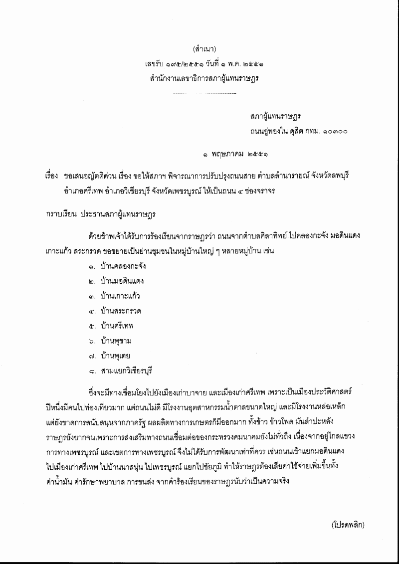 (10) ญัตติ เรื่อง ขอให้สภาฯ พิจารณาการปรับปรุงถนนสายตำบลลำนารายณ์ จังหวัดลพบุรี อำเภอศรีเทพ อำเภอวิเชียรบุรี จังหวัดเพชรบูรณ์ ให้เป็นถนน ๔ ช่องจราจร (นายนิยม วรปัญญา และนายอำนวย คลังผา เป็นผู้เสนอ) |