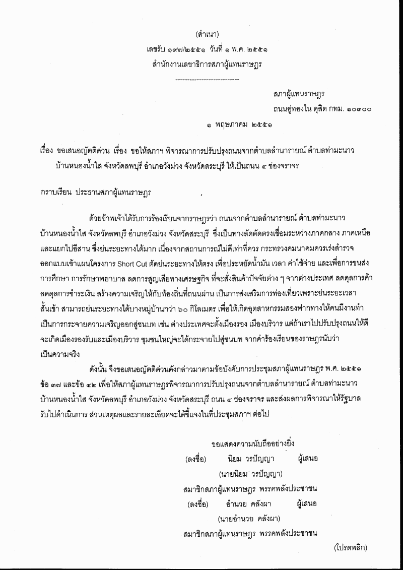 (12) ญัตติ เรื่อง ขอให้สภาฯ พิจารณาการปรับปรุงถนนจากตำบลลำนารายณ์ ตำบลท่ามะนาว บ้านหนองน้ำใส จังหวัดลพบุรี อำเภอวังม่วง จังหวัดสระบุรี ให้เป็นถนน ๔ ช่องจราจร (นายนิยม วรปัญญา และนายอำนวย คลังผา เป็นผู้เสนอ) |