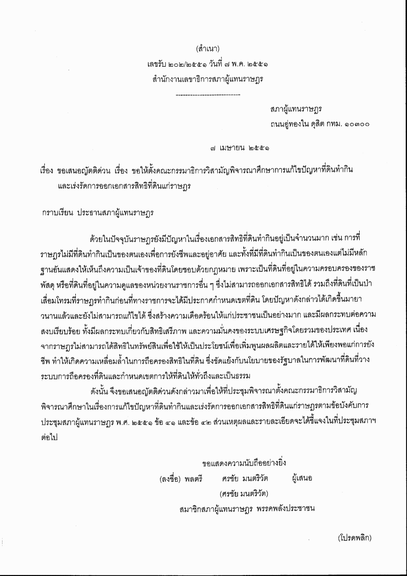 • (17) ญัตติ เรื่อง ขอให้สภาฯ ตั้งคณะกรรมาธิการวิสามัญพิจารณาศึกษาการแก้ไขปัญหาที่ดินทำกินและเร่งรัดการออกเอกสารสิทธิที่ดินแก่ราษฎร (พลตรี ศรชัย มนตริวัต เป็นผู้เสนอ)