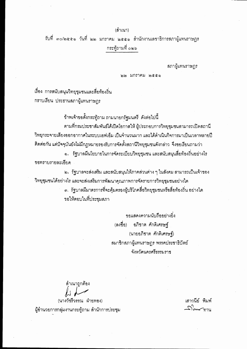 กระทู้ถาม ที่ ๐๒๖ เรื่อง การสนับสนุนวิทยุชุมชนและสื่อท้องถิ่น นายอภิชาต ศักดิเศรษฐ์ เป็นผู้ตั้งกระทู้ถาม ถาม นายกรัฐมนตรี |