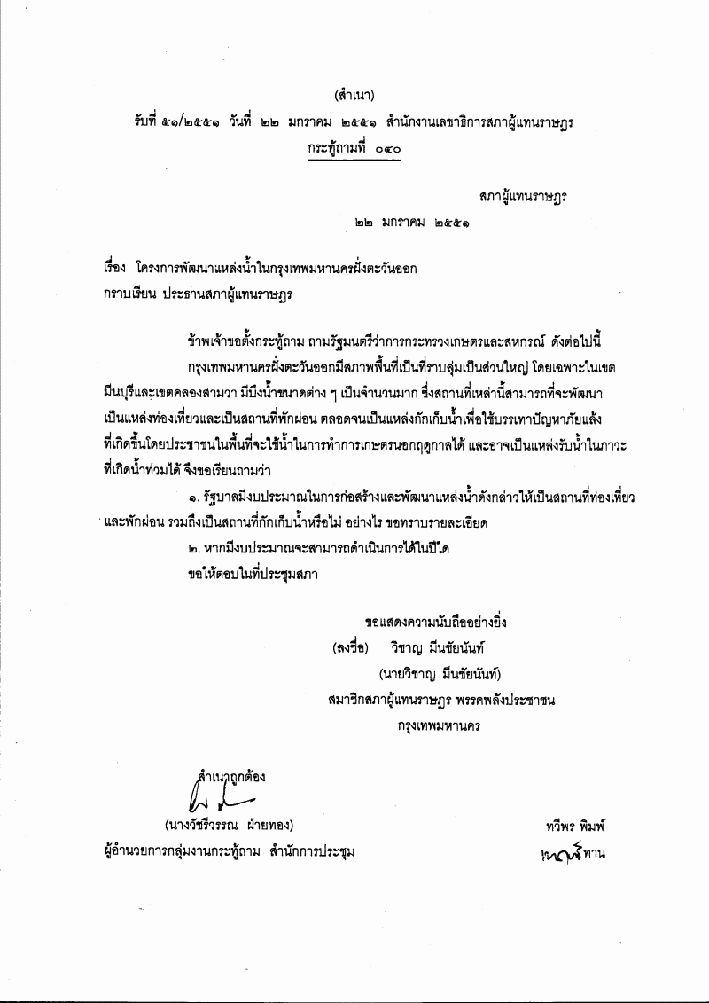 กระทู้ถาม ที่ ๐๔๐ เรื่อง โครงการพัฒนาแหล่งน้ำในกรุงเทพมหานครฝั่งตะวันออก นายวิชาญ มีนชัยนันท์ เป็นผู้ตั้งกระทู้ถาม ถาม รัฐมนตรีว่าการกระทรวงเกษตรและสหกรณ์ |