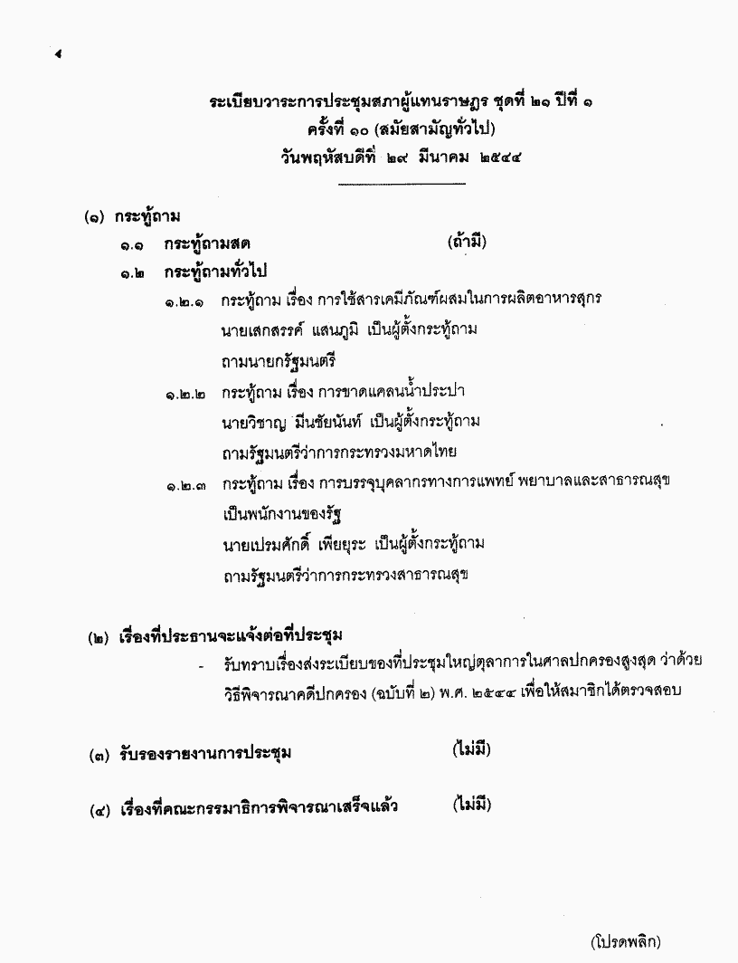 • ระเบียบวาระการประชุมสภาผู้แทนราษฎร ชุดที่ ๒๑ ปีที่ ๑ ครั้งที่ ๑๐ (สมัยสามัญทั่วไป) วันพฤหัสบดีที่ ๒๙ มีนาคม ๒๕๔๔