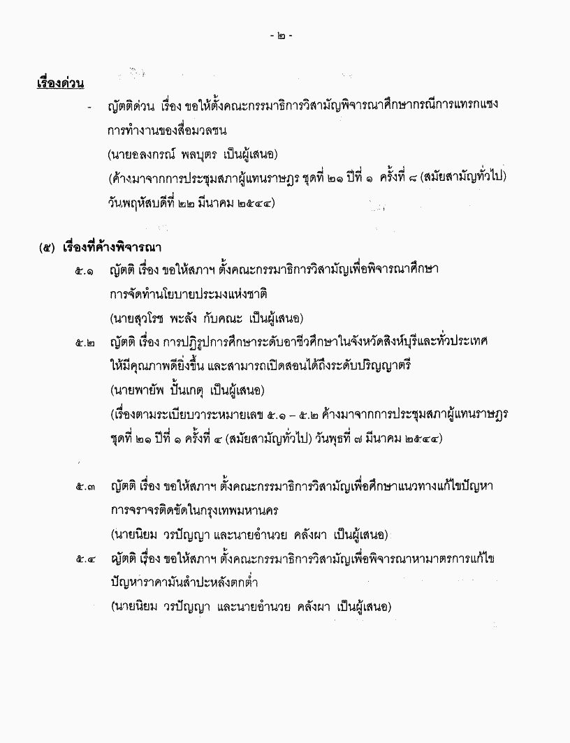 • ระเบียบวาระการประชุมสภาผู้แทนราษฎร ชุดที่ ๒๑ ปีที่ ๑ ครั้งที่ ๑๐ (สมัยสามัญทั่วไป) วันพฤหัสบดีที่ ๒๙ มีนาคม ๒๕๔๔